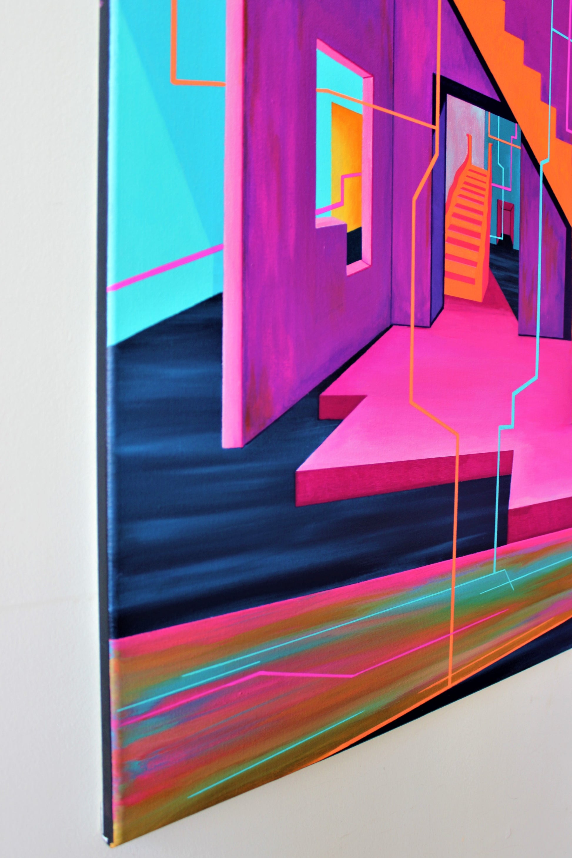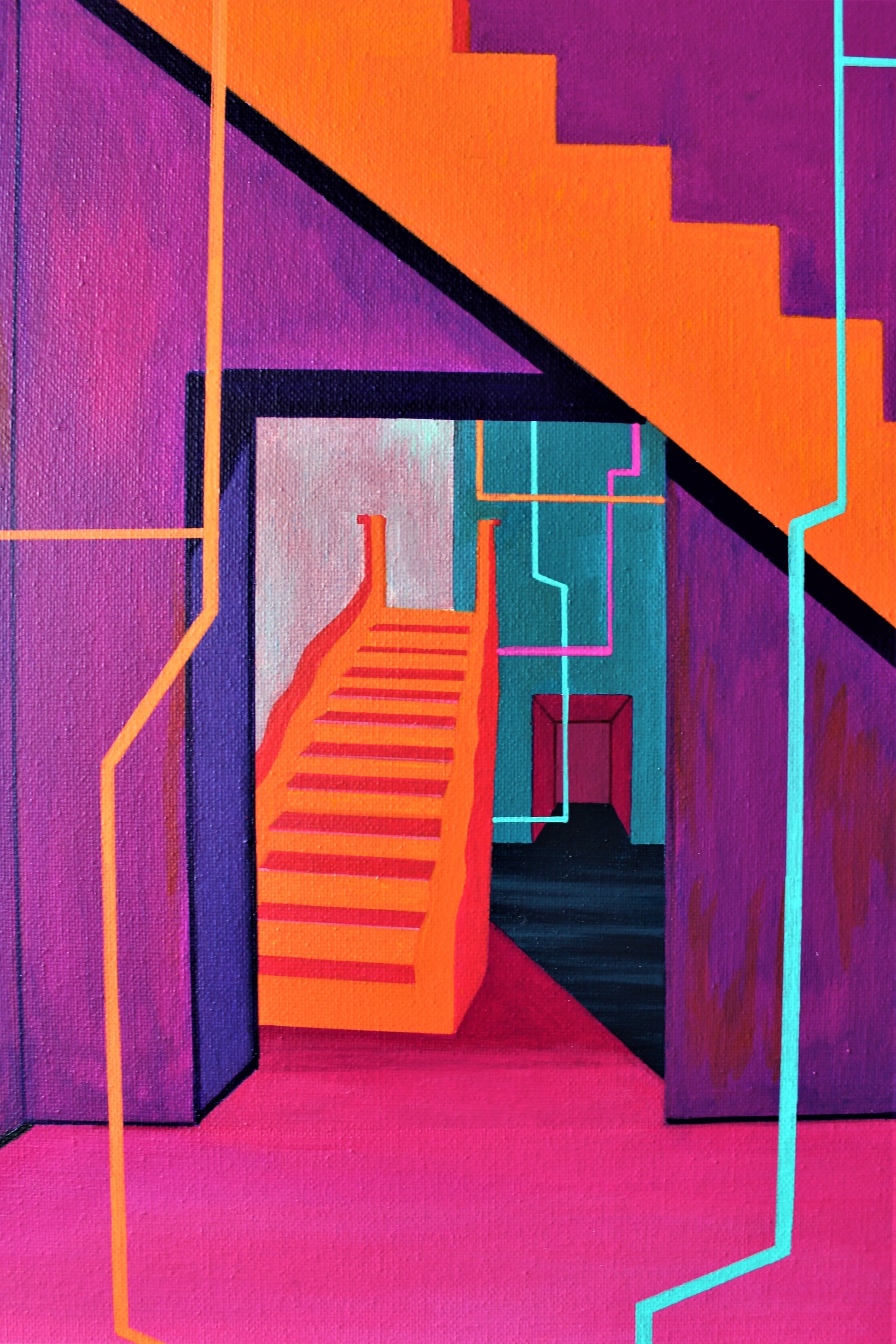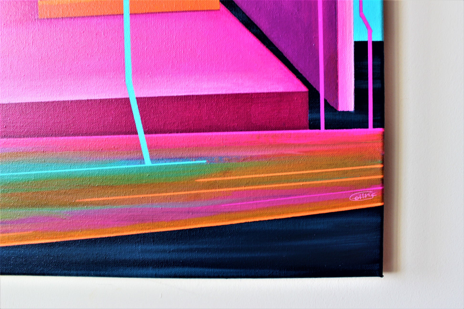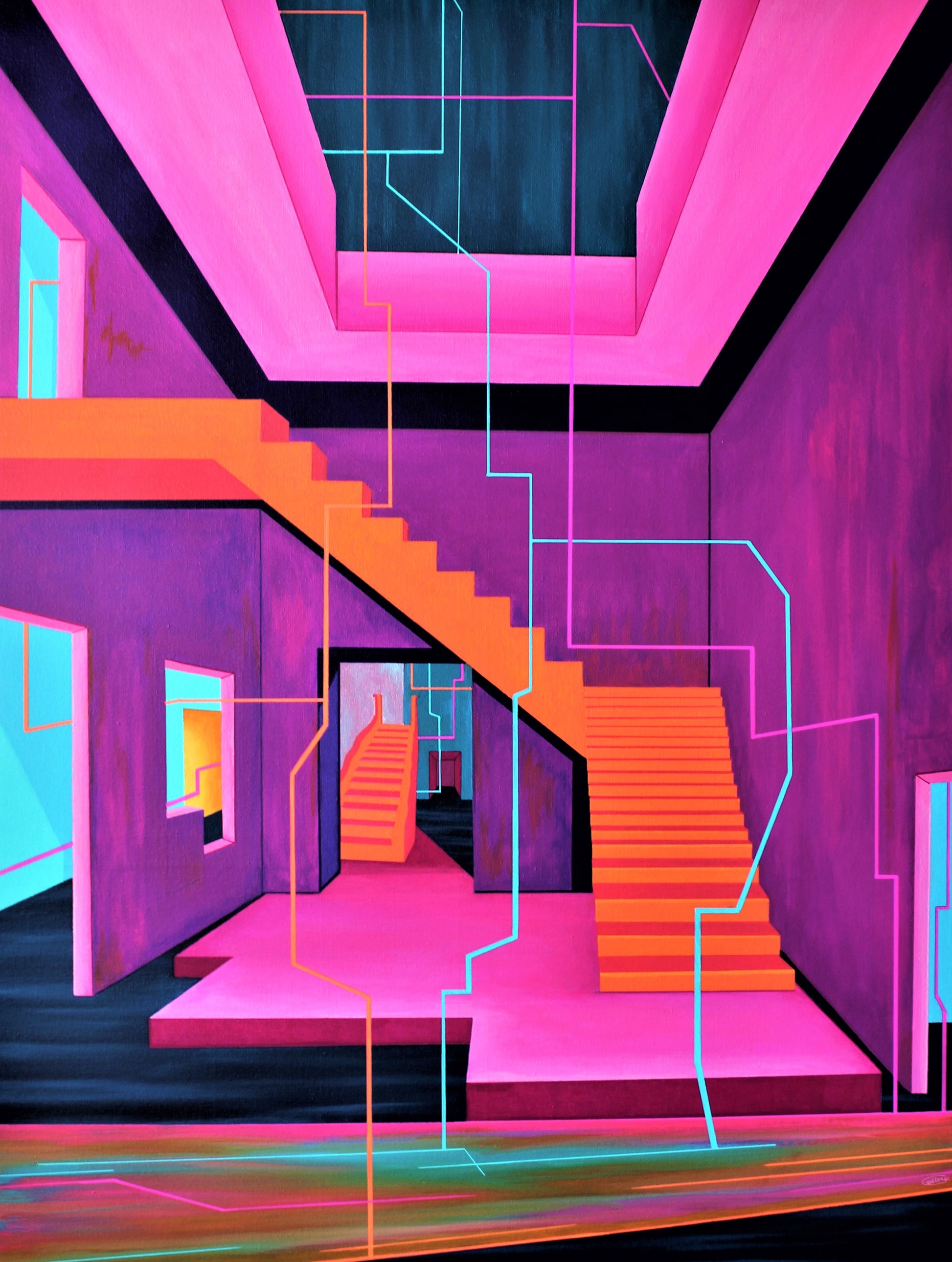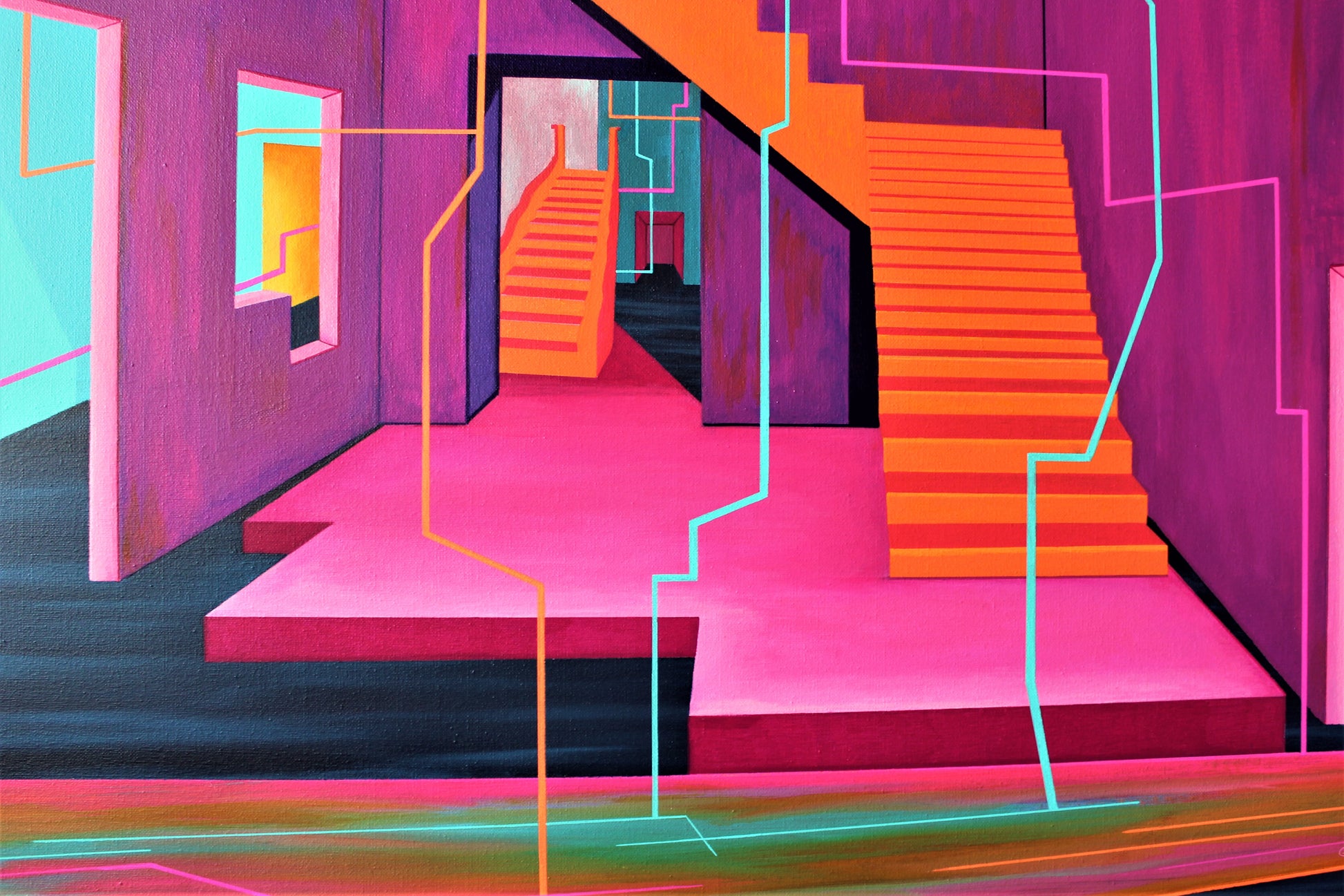 In this collection, vibrant colours and dynamic compositions come together to delve into the concept of transitional spaces - those 'in-between' places characterized by ambiguity, fluidity, and a sense of threshold where boundaries blur and new possibilities emerge.