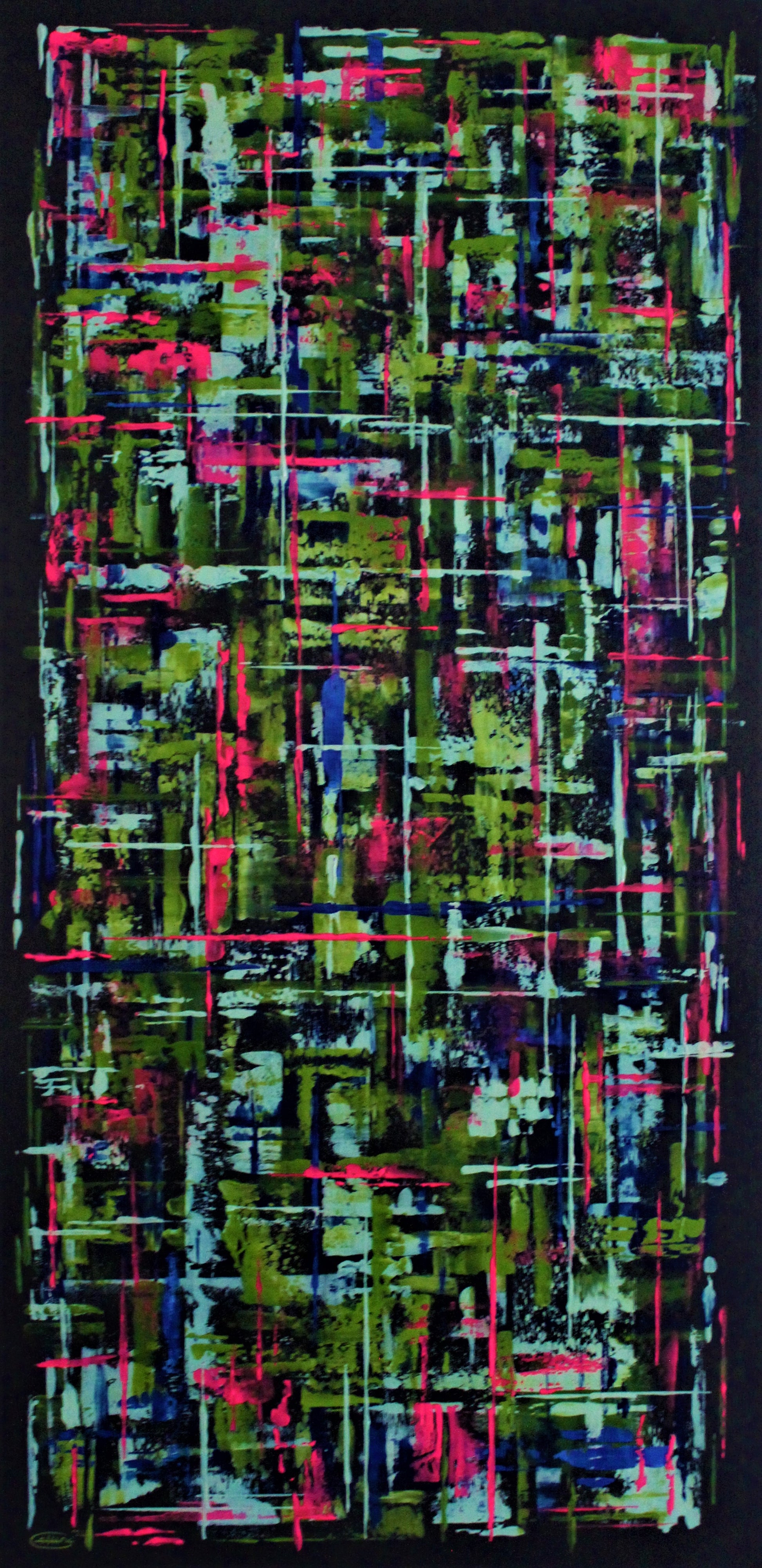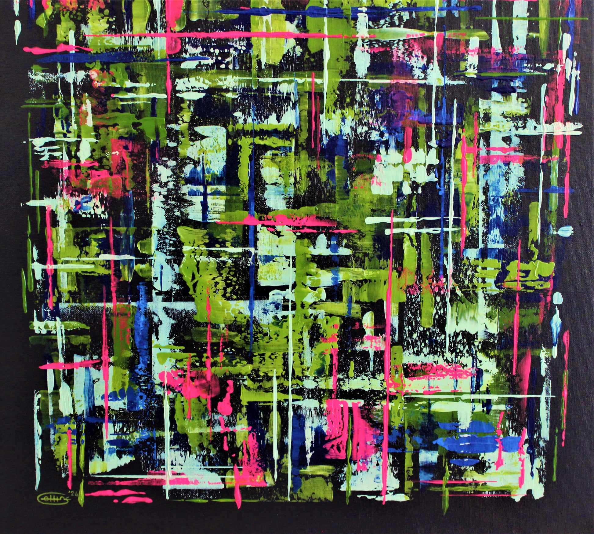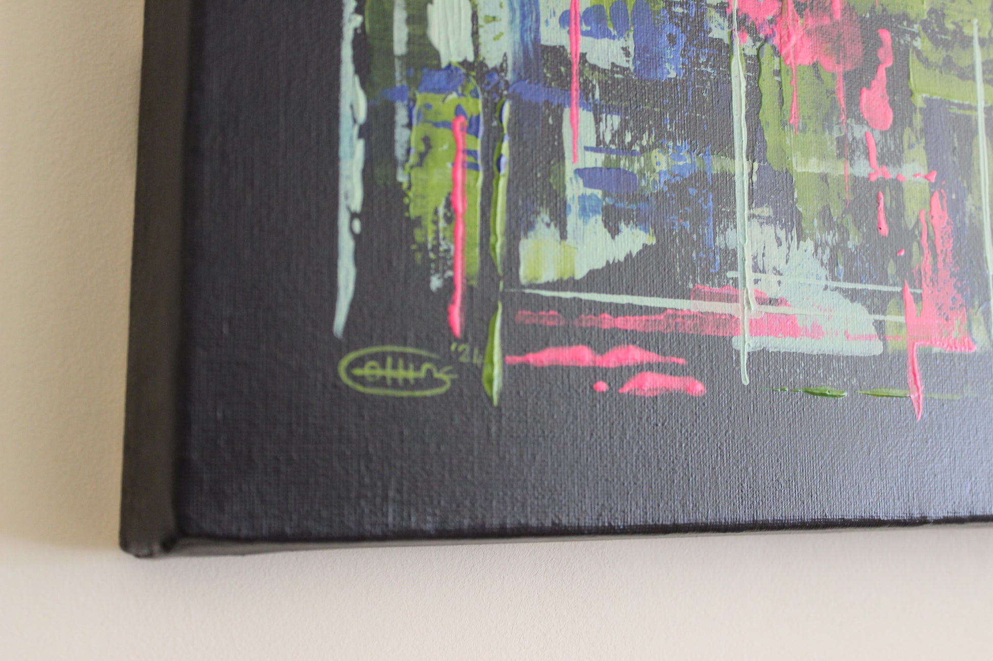 "Uncharted Course" is a captivating abstract painting that plunges viewers into the heart of an unexplored journey. The canvas bursts with energy with palette knife-crafted lines that draw the eye across the canvas. Blue and earthy greens travel across a deep indigo backdrop, further punctuated by streaks of neon pink, representing flashes of insight and moments of clarity amidst uncertainty.